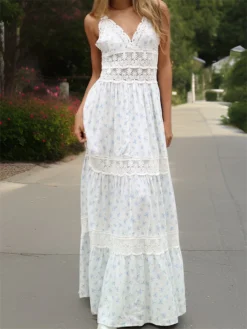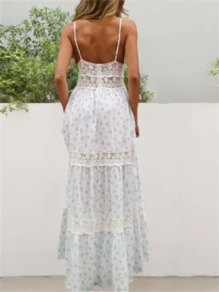 Summer Women Flower Print Dress Lace Patchwork Sleeveless Corset Ruffle Bohemian Long Dress for Cocktail Party