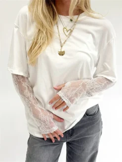 Women Casual T-Shirts Lace Long Sleeve Round Neck Shirts Spring Summer Loose Fit Tops Streetwear
