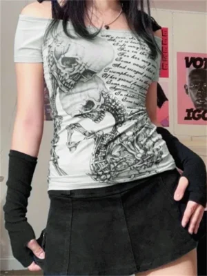 2024 Summer Women T-shirt Vintage Skull Print Gothic Grunge Y2K Tee Tops Off Shoulder Tie-up Short Sleeve Shirts Casual