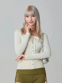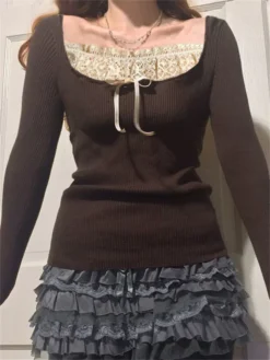 Women Long Sleeve T-shirt Retro Fairycore Grunge Y2K Tops Lace Square Neck Slim Fit Shirts Harajuku Autumn Streetwear Female