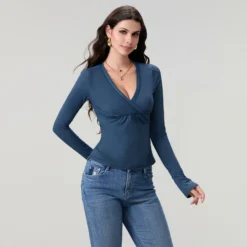 Women’s Spring Fall Tops Solid Color Long Sleeve Wrap V-Neck Shirts Y2K Aesthetic Casual Elegant T-shirt Streetwear