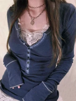 Women Spring Fall Shirts Y2K Aesthetic Grunge Shirts Long Sleeve Lace Patchwork Tops 90s Vintage Fairy Harajuku Blouse