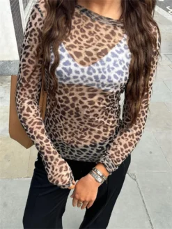 Women Mesh T-shirt Summer Print Sheer Sexy Shirts Long Sleeve See Through Beach Club Crop Tee Tops Summer Autumn