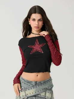 Women T-shirt Long Sleeve Crew Neck Star Stripe Star Graphic Slim Fit Tee Tops Ladies for Casual Daily Gothic Y2K Shirts