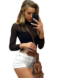 Women Long Sleeve T-shirt Mesh Lace See through Ruched Mock Neck Shirts Summer Sexy Club Beach Tops and Blouses Streetwear