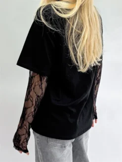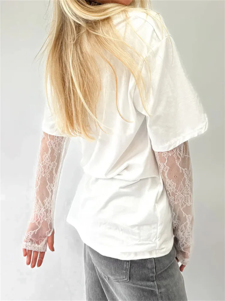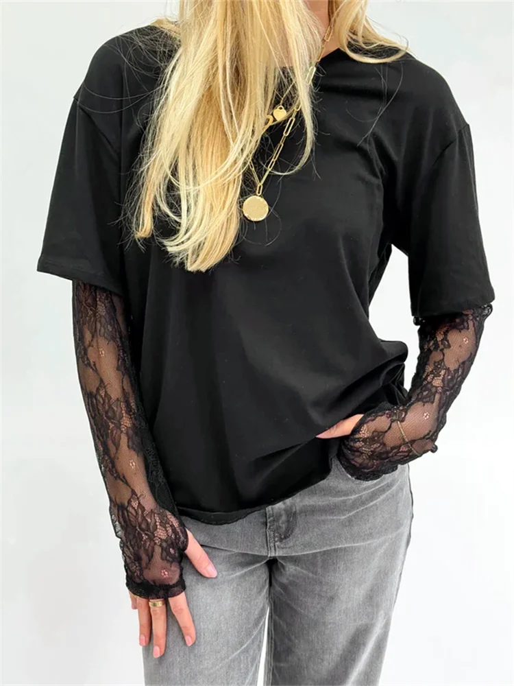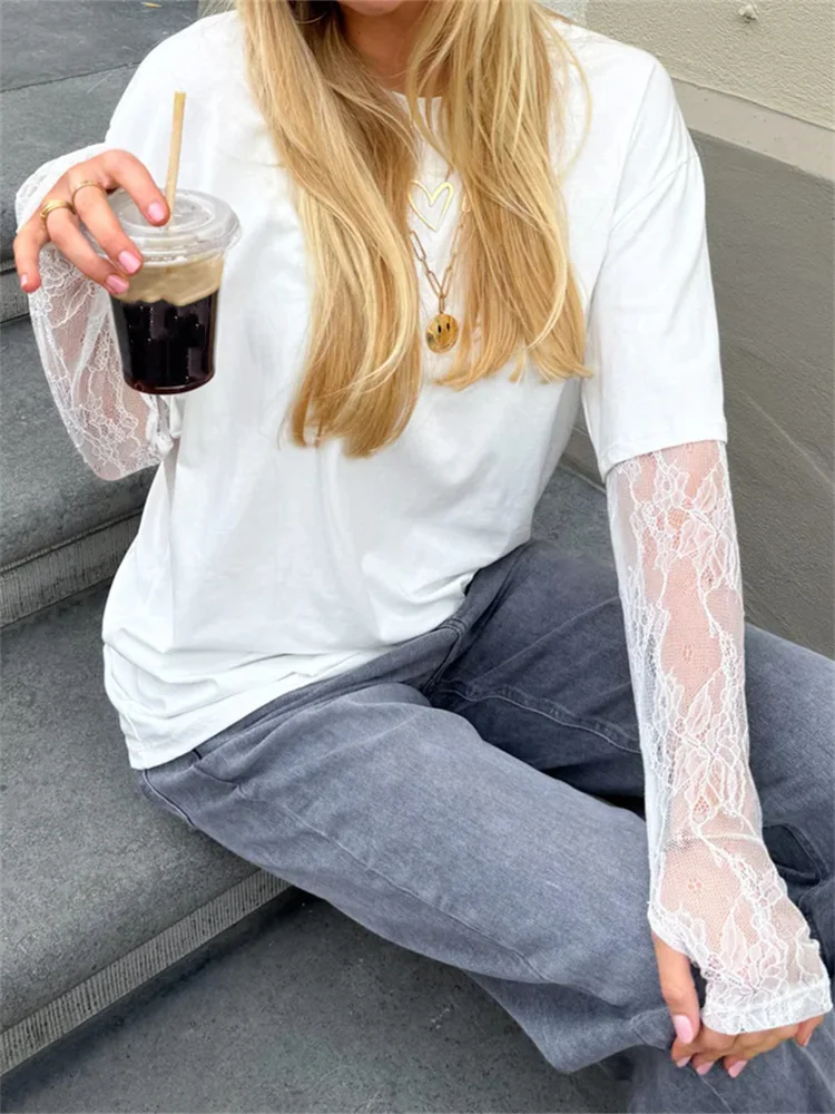 Women Casual T-Shirts Lace Long Sleeve Round Neck Shirts Spring Summer Loose Fit Tops Streetwear