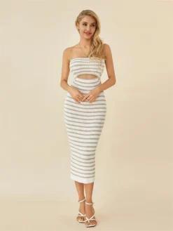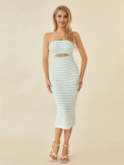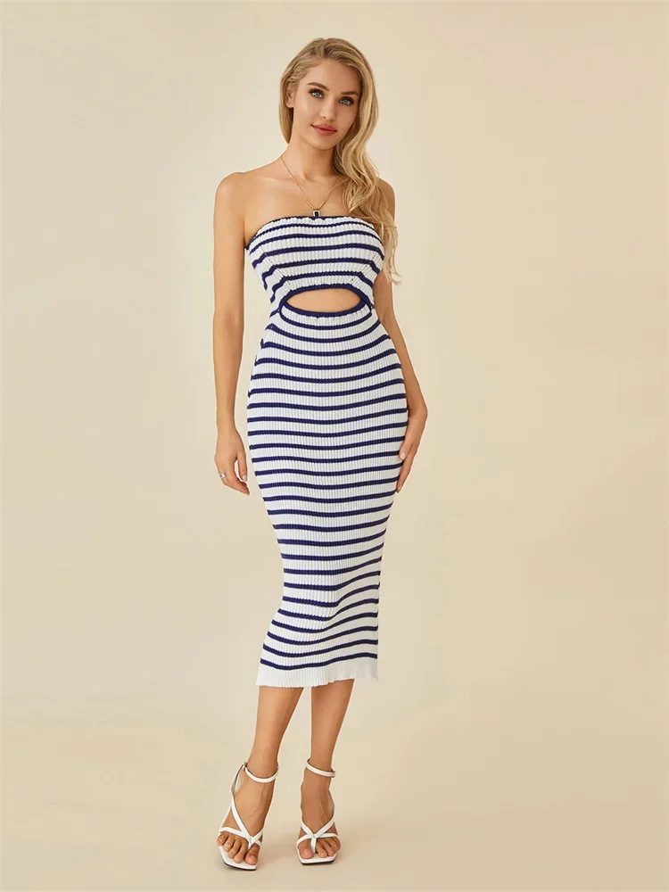 Women Knitted Tube Dress Strapless Hollow Out Bodycon Long Dress Summer Casual Elegant Y2K Clubwear