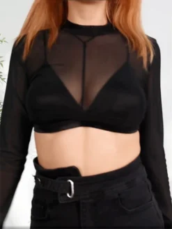 Black mesh see-through bottoming shirt with exposed navel design, sexy with temptation.