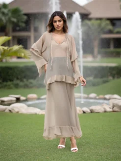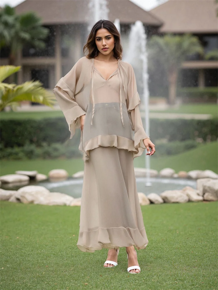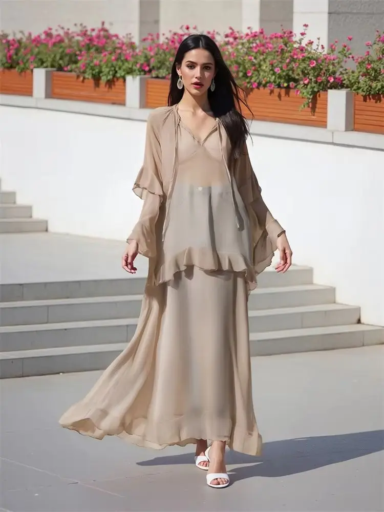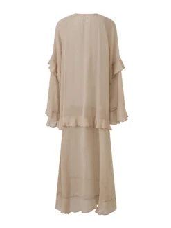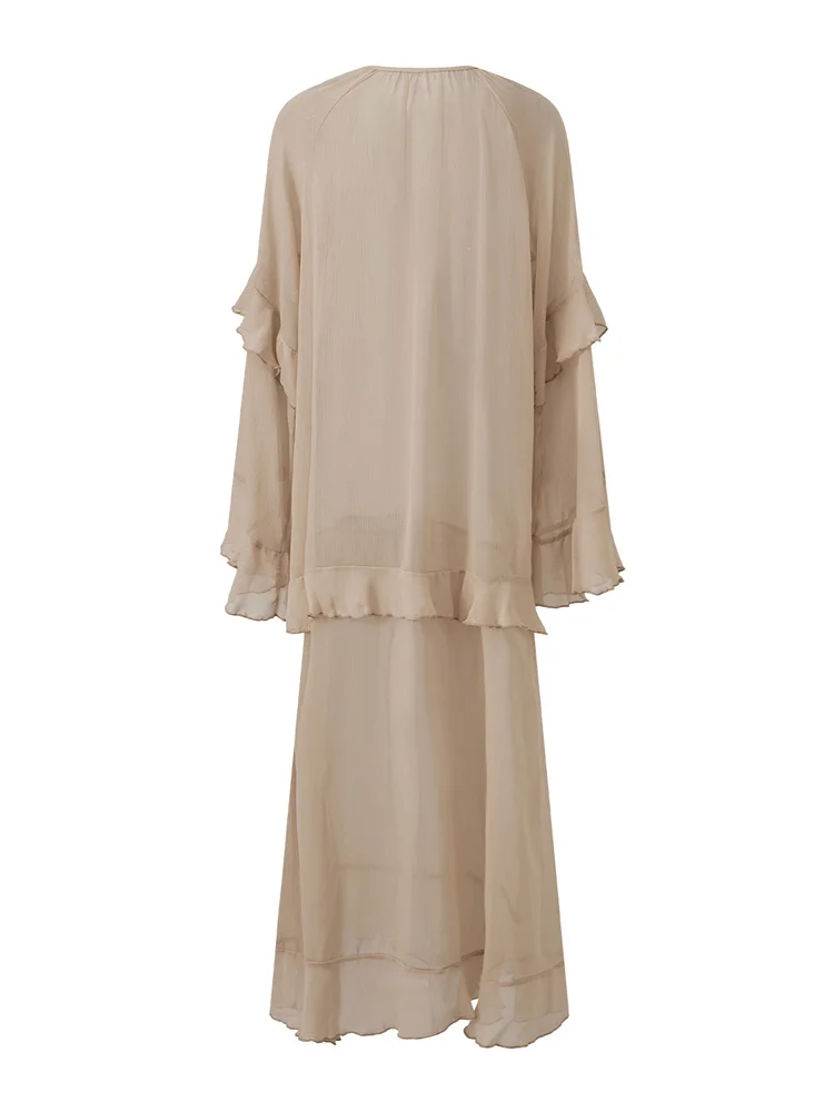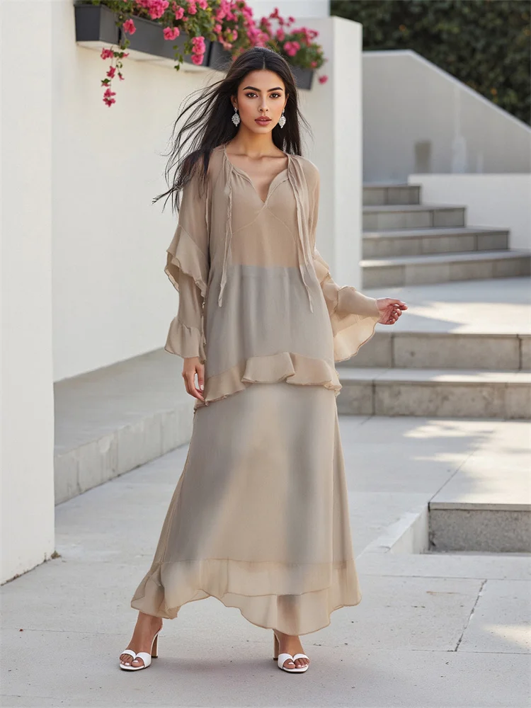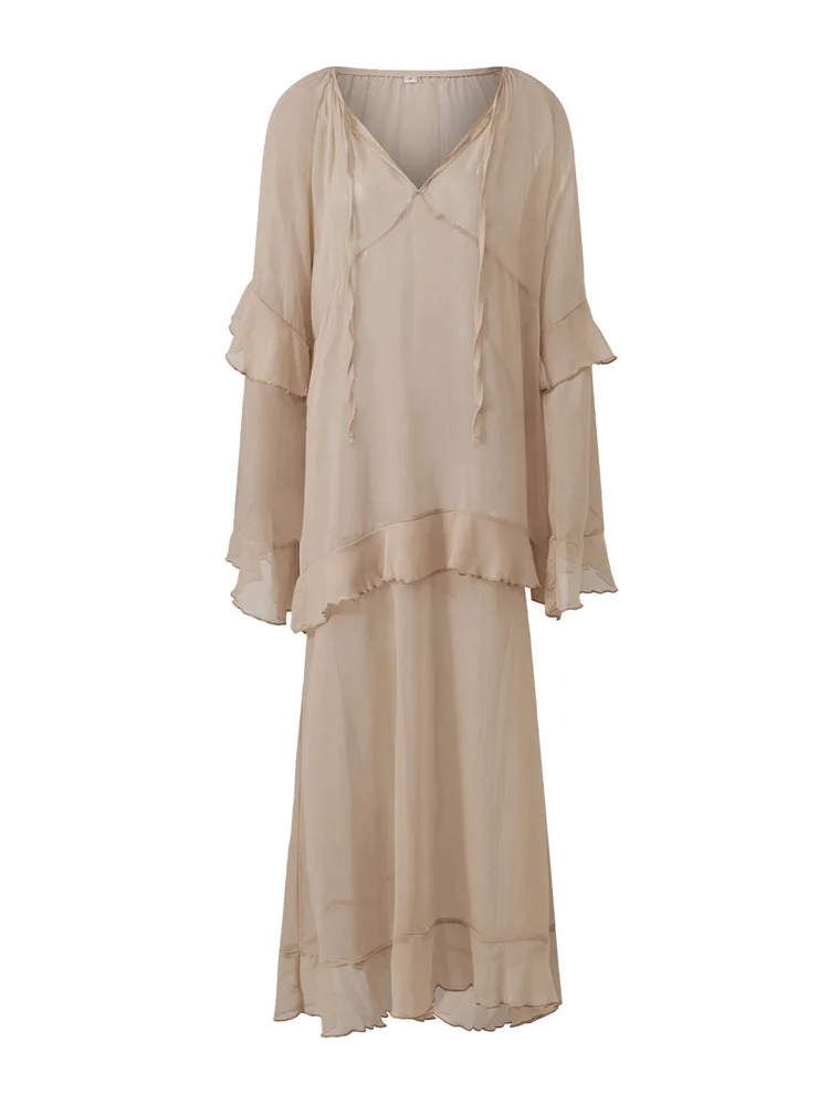 Women Sheer Long Dress Summer Fall Loose Fit Stylish Ruffled Trim Solid V Neck Long Sleeve Dresses