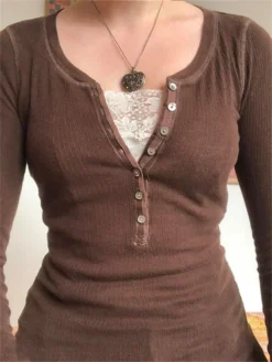 Lace patchwork vintage long sleeve women’s tops, 1/2 button fake two piece women’s casual pullover basic t-shirt, stylish and comfortable streetwear.
