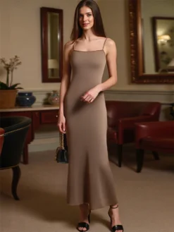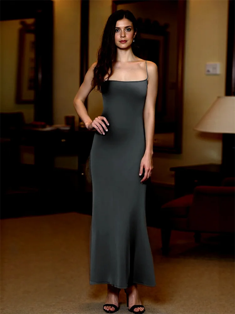 Women’s Solid Color Cami Dress Sleeveless Spaghetti Strap Bodycon Long Dress Summer Party Dress
